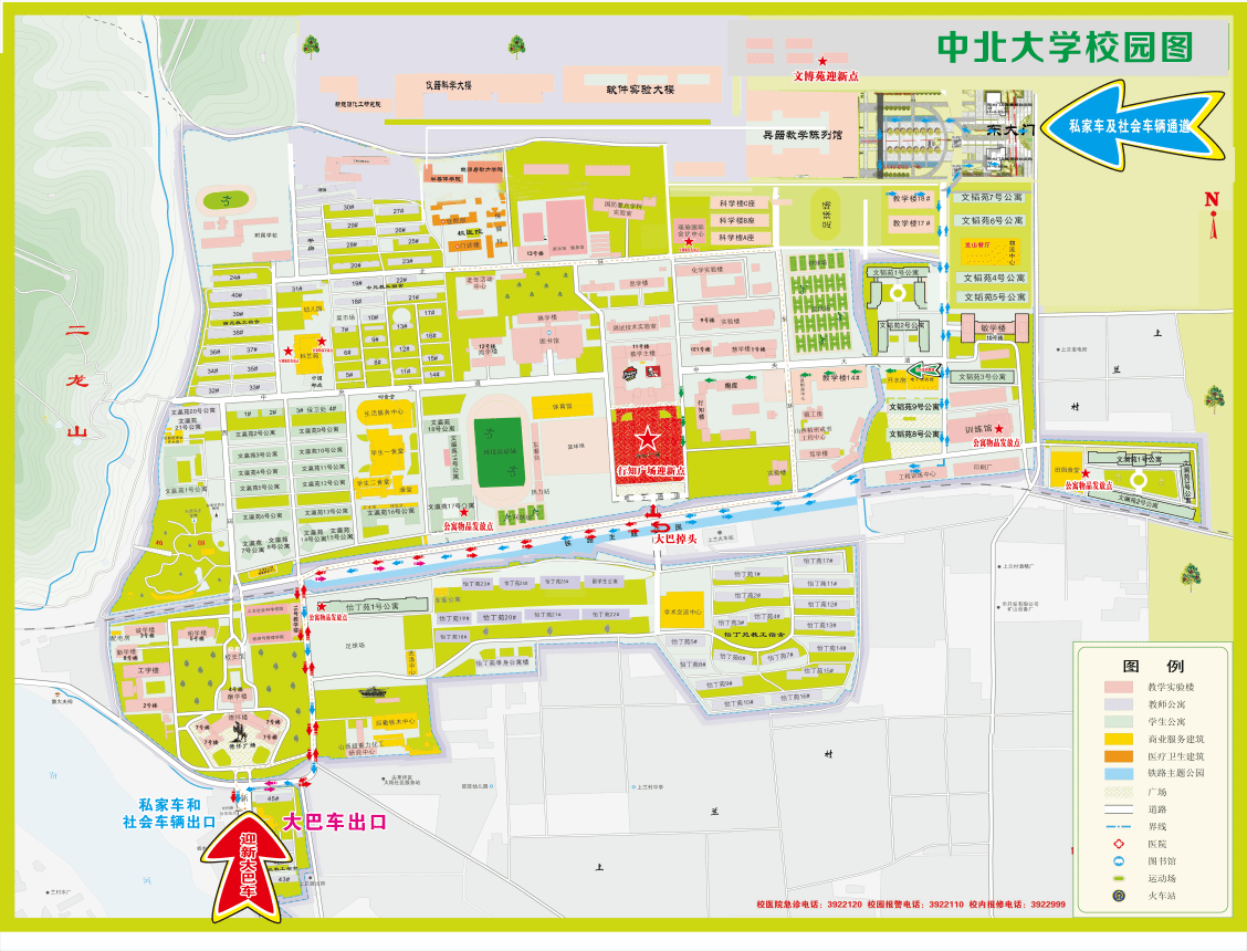(2)送行人员可以和新生一起入校,迎新期间校内道路全部开通,车辆从“中北大学东门”进入,入校后严格按道路交通指示或引导标识行驶,车辆停放后务必在车辆明显处留司机电话,便于车辆疏导。离开学校的车辆可以就近选择从学校南门或者东门离校。