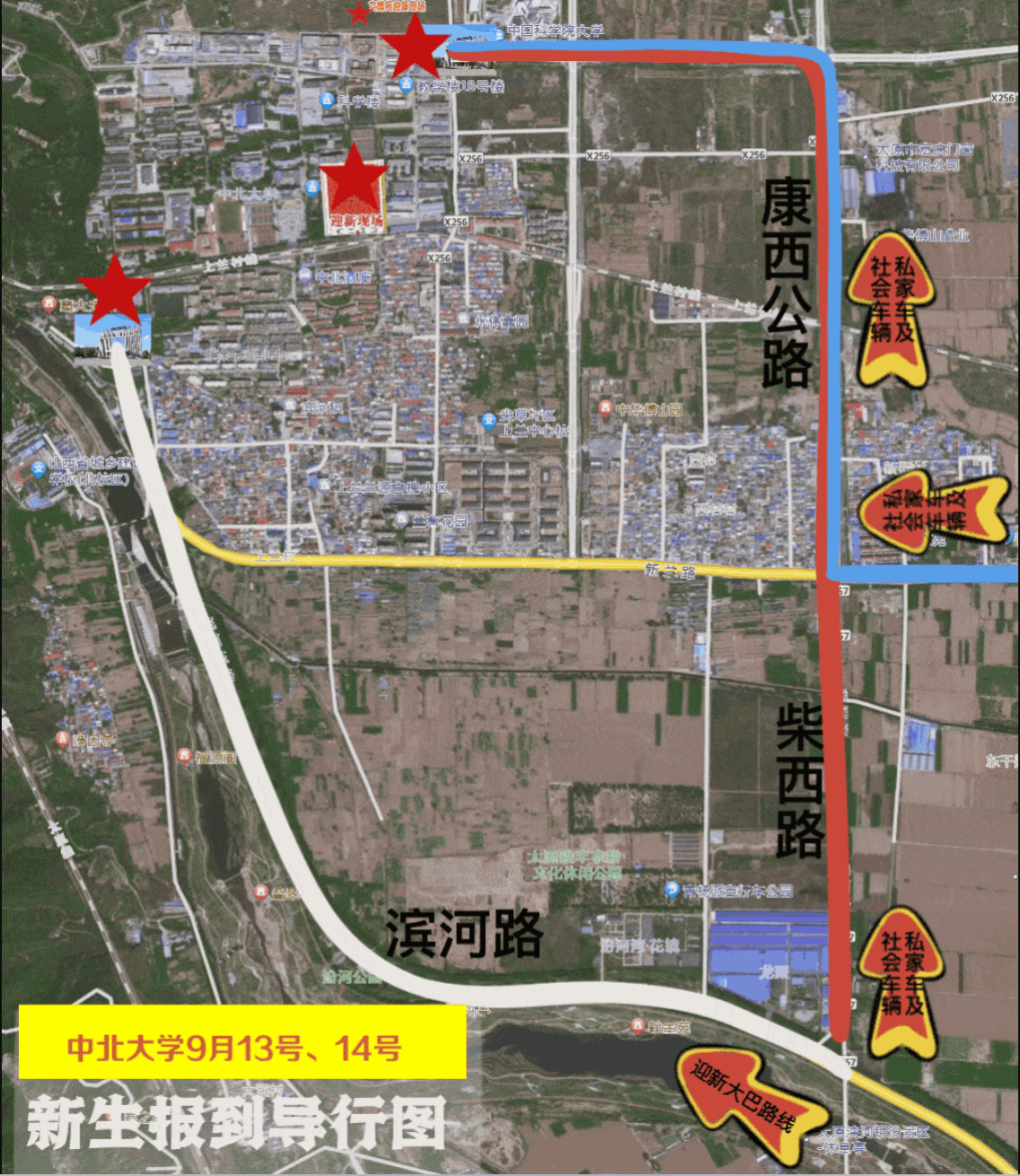 1、路线:私家车及社会车辆导航至“中北大学(东门)”入校, 按照引导,到行知广场各学院迎新点报到;新北区研究生报到:“中北大学(东门)”入校,进门右拐至文博苑迎新点。